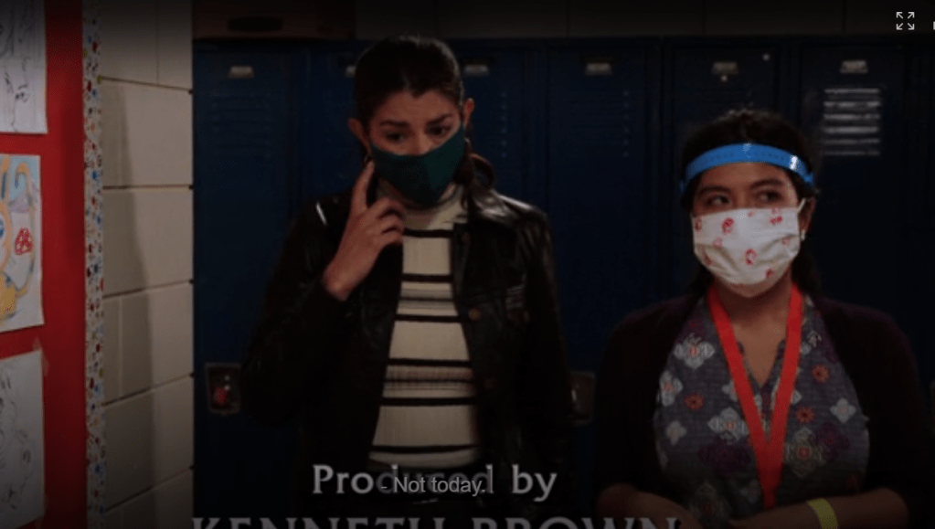 In the first shot, they have just rounded a corner, and the students who were milling around have disappeared into classes. Maybe it’s because the students aren’t still around, but there is no really clear reason suggested why they can unmask. We see the detective starting to pull her mask off in first shot, then they both are mostly unmasked in second shot. They then have a standing-close face-to-face conversation, no mention of why that’s okay.